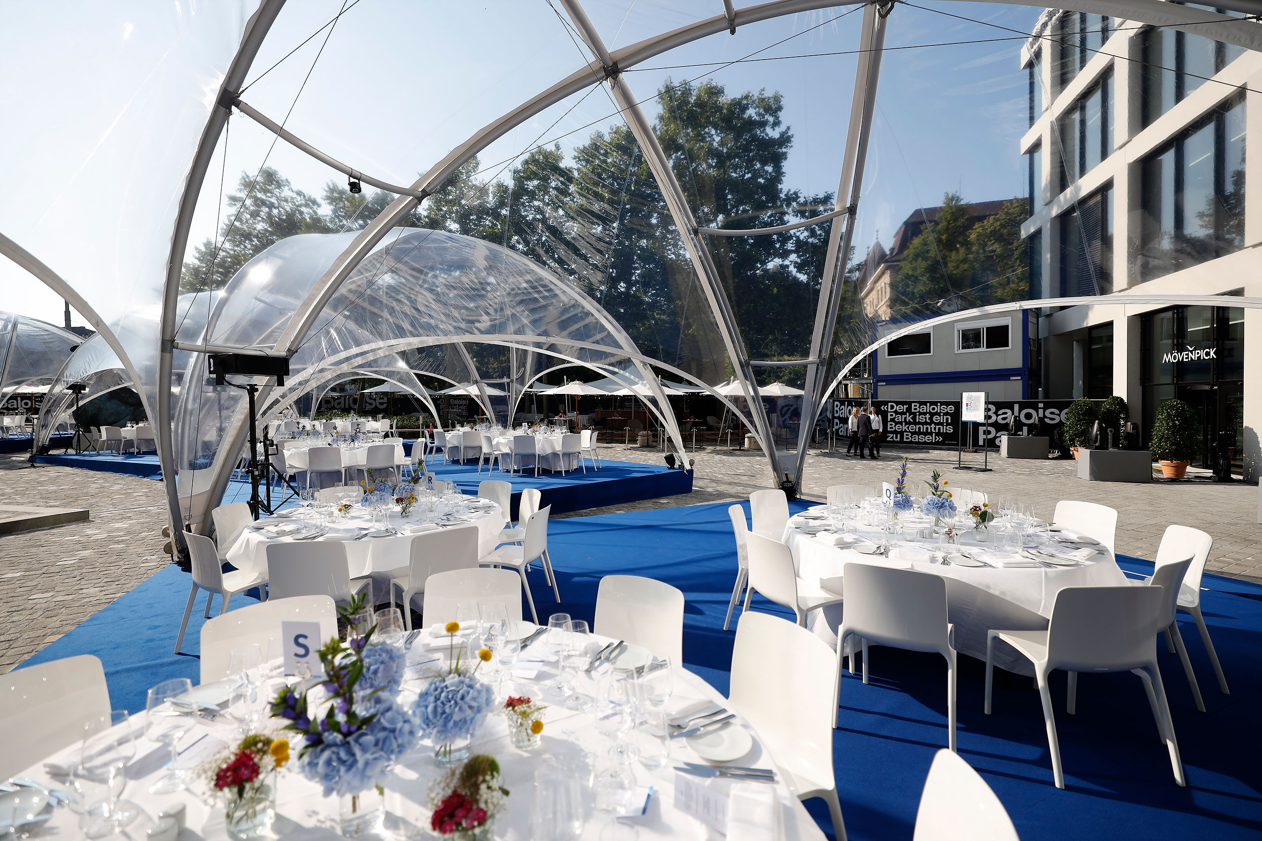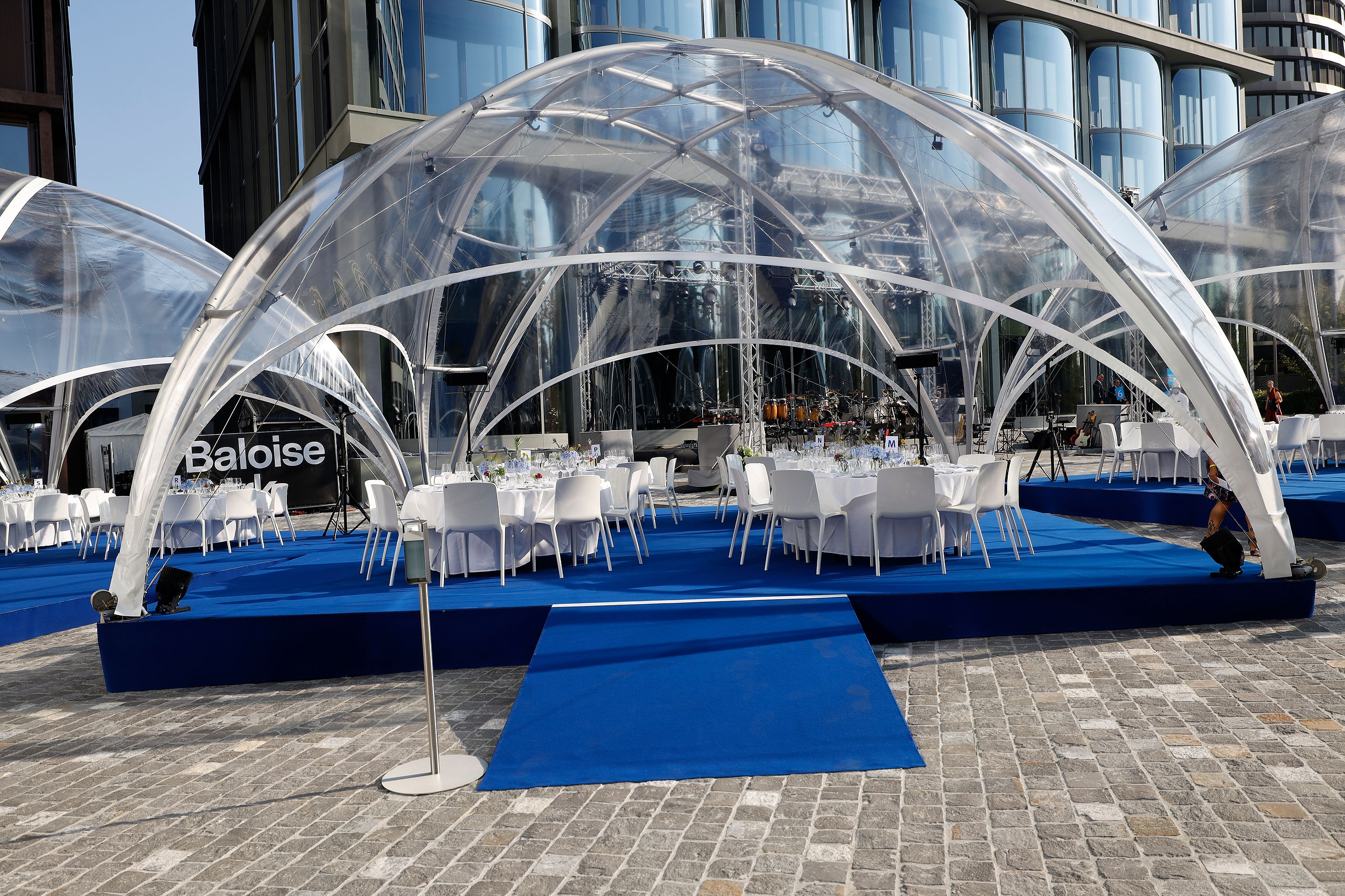 Configuration couplée de deux tentes Crossover M, parfaite pour les grandes réceptions et événements d'envergure. Idéal pour réceptions corporate et scènes couvertes.